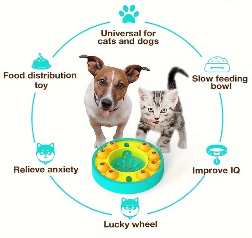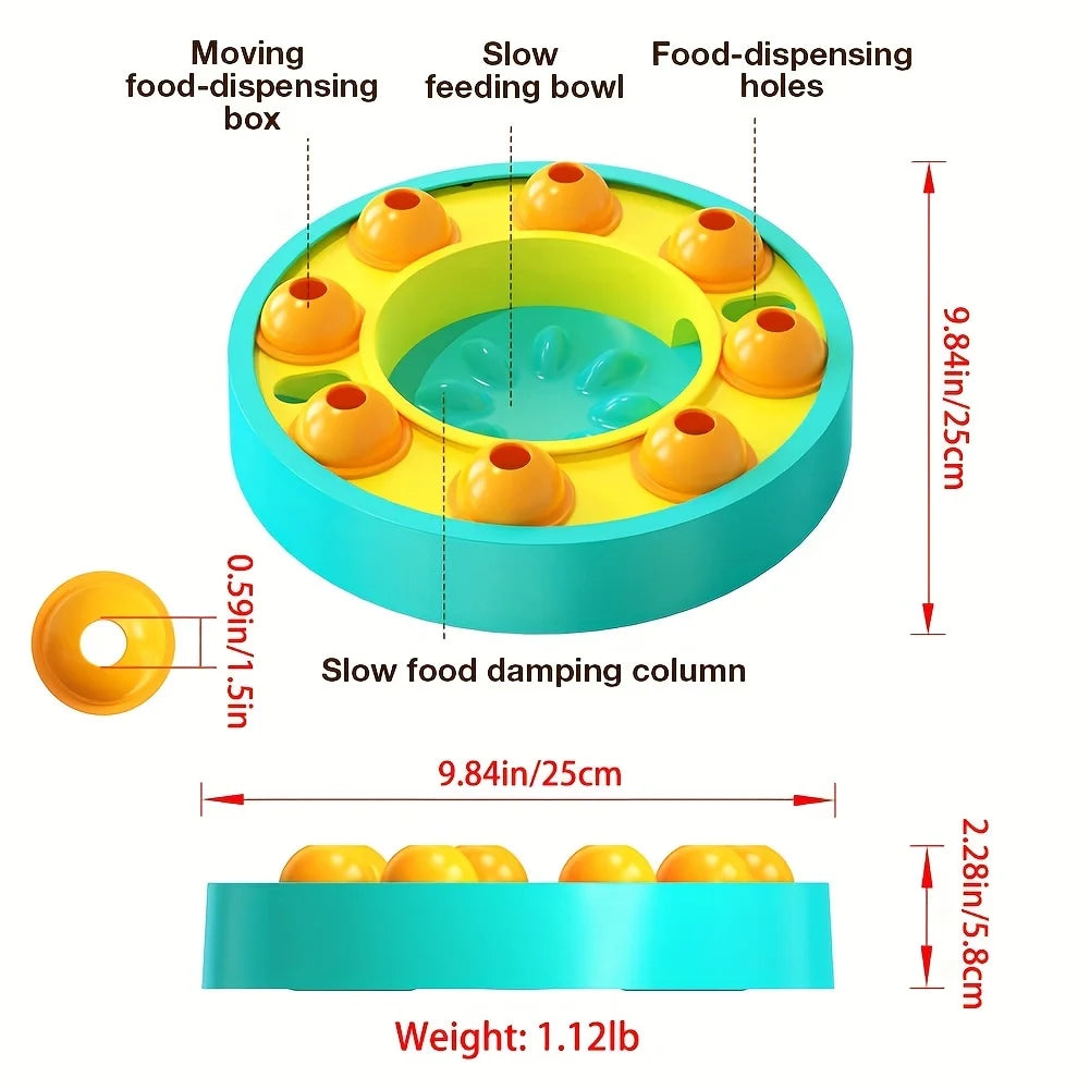 【Spinning food dispensing wheel】 On the top of the toy, we have a food-dispensing wheel, on the track of the toy, we have several spinning granaries, on the top of the granary, we can put doggy food and snacks inside the hole, doggy will push the granary with its paw, doggy's snacks will be spilled out on the slower feeder plate as soon as the granary matches the food dispensing hole, doggy will get rewards during playtime, this is for holding doggy's attention.